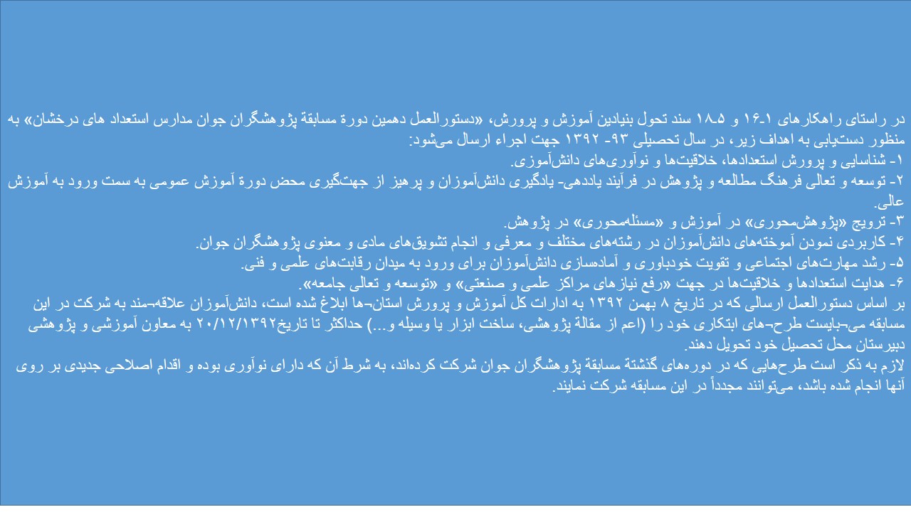 نام: نام خانوادگی: نام پدر: شماره ملی: سال تولد: محل تولد: پایه تحصیلی: رایانامه (ایمیل): کدشهرستان: شماره تلفن ثابت منزل: کدپستی منزل: شماره تلفن همراه: نشانی پستی منزل: شرح عملکرد در طرح: