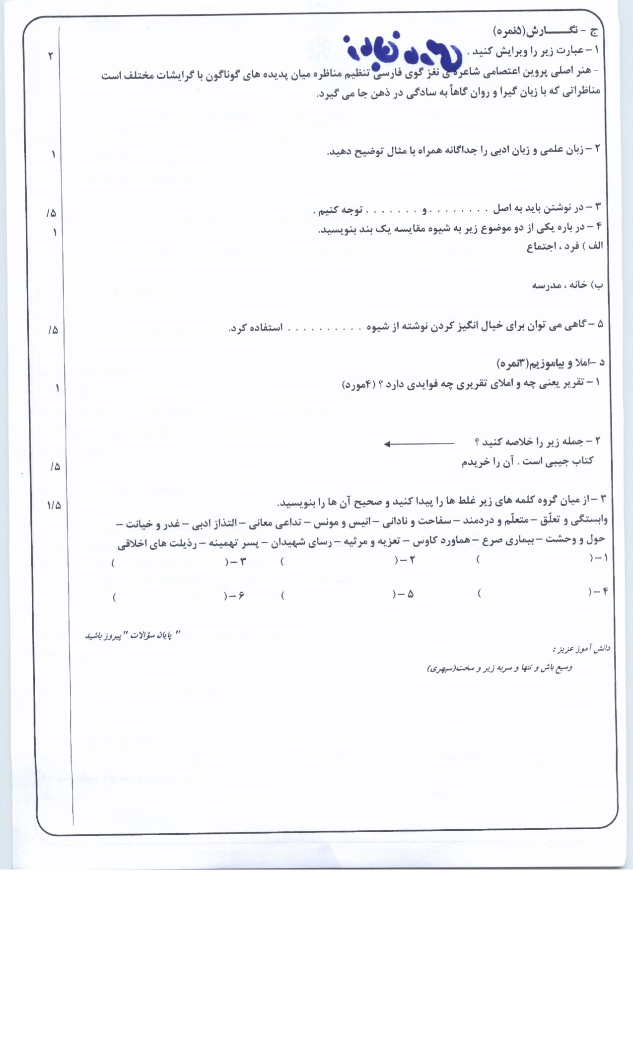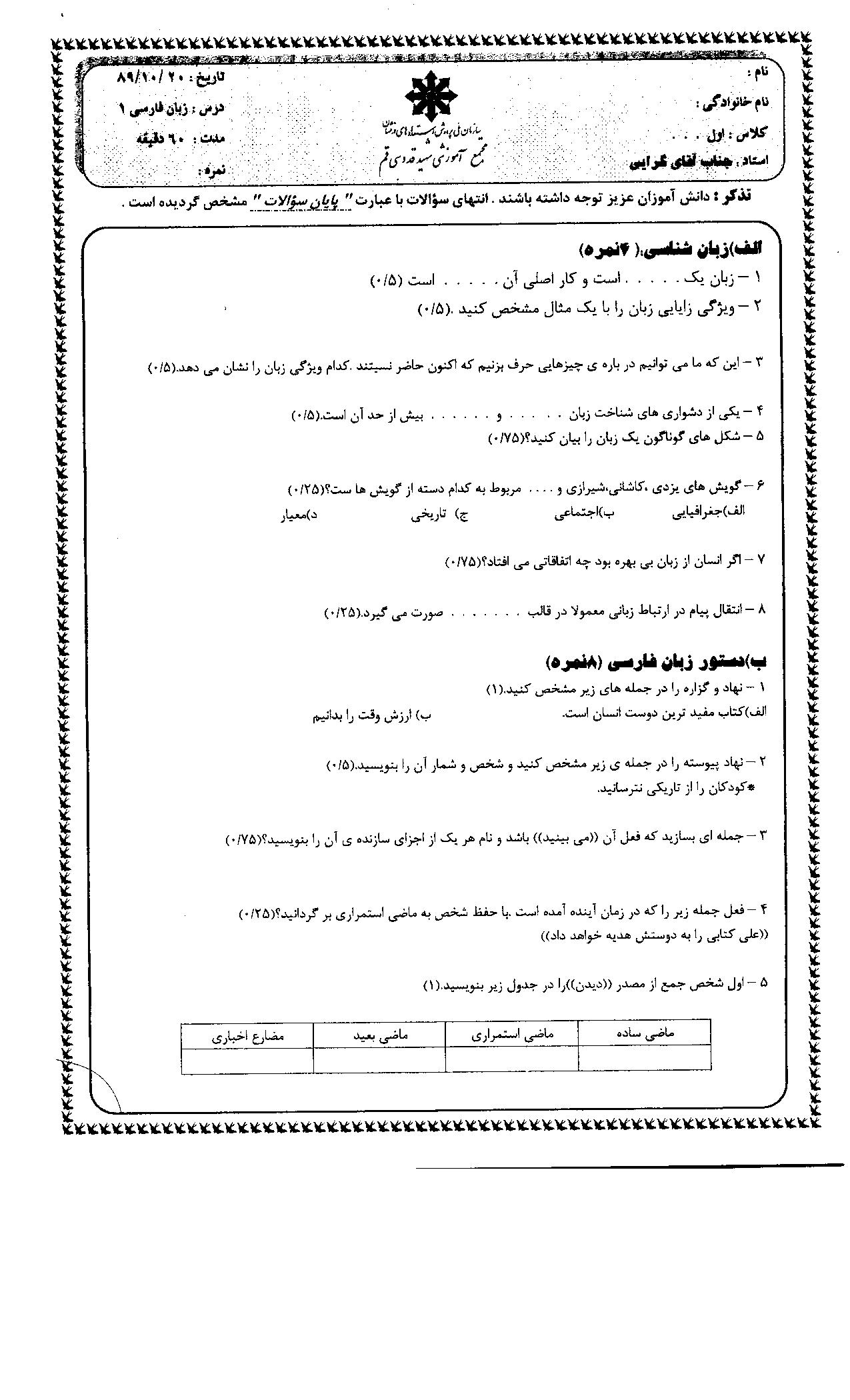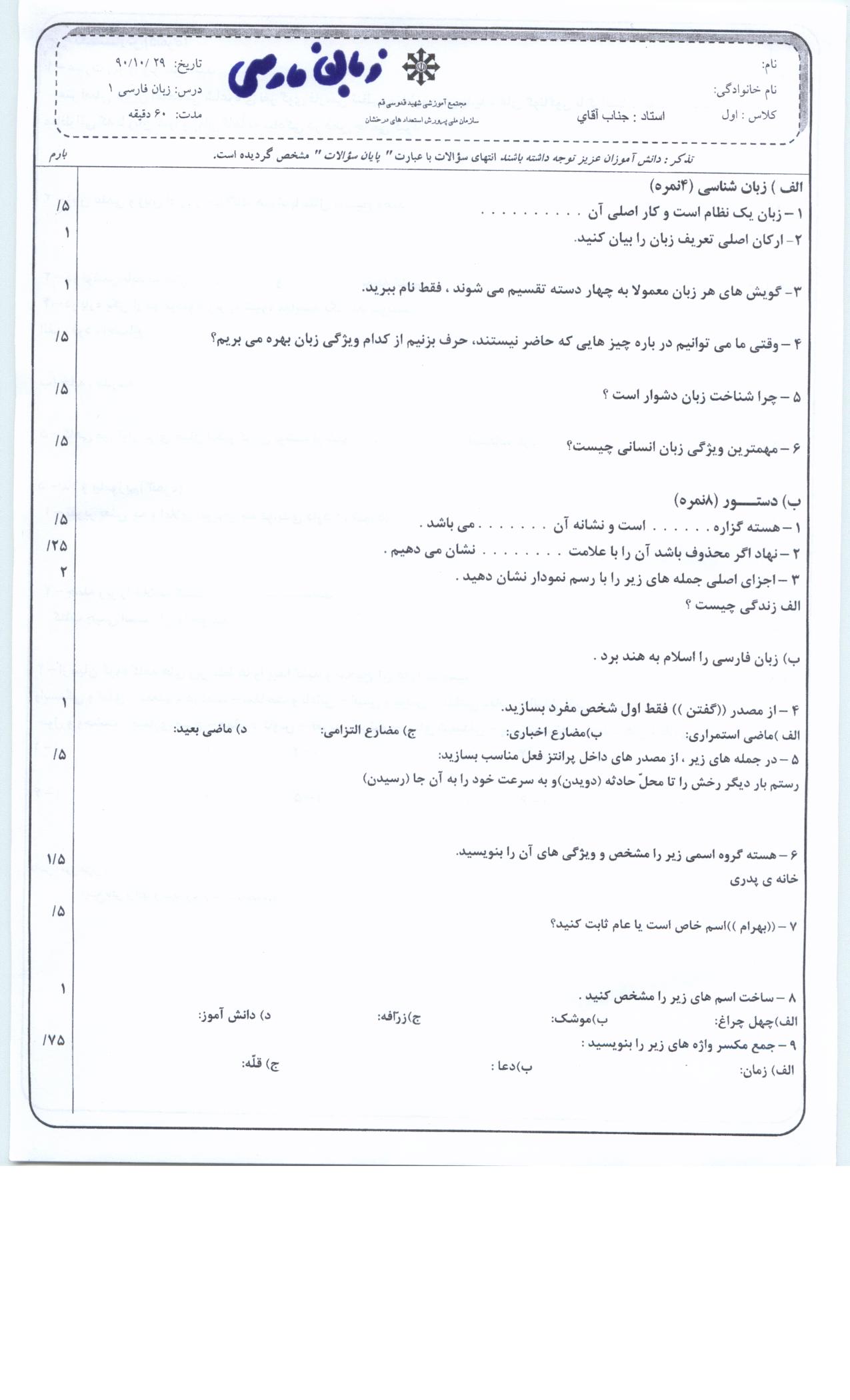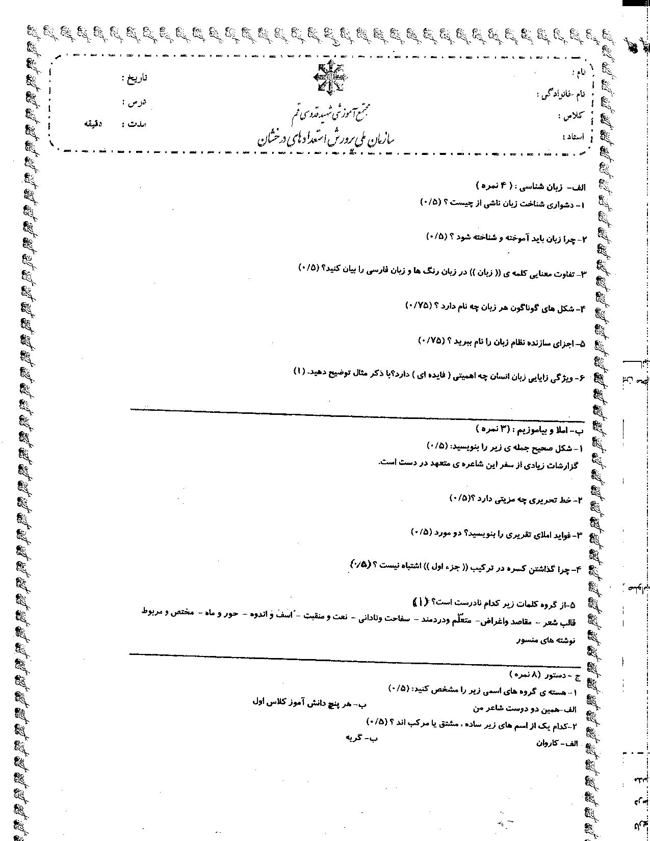 نمونه سوال زبان فارسی نوبت اول + پاسخ